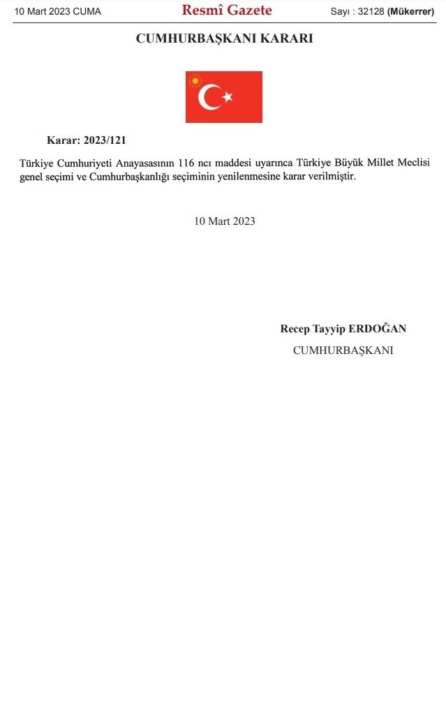 Resmi Gazete'de 2023/121 sayılı Cumhurbaşkanı Kararı ile Türkiye Cumhuriyeti Anayasası'nın 116. maddesi uyarınca Türkiye Büyük Millet Meclisi (TBMM) genel seçimi ve Cumhurbaşkanlığı seçiminin yenilenmesine karar verildiği yayımlandı.