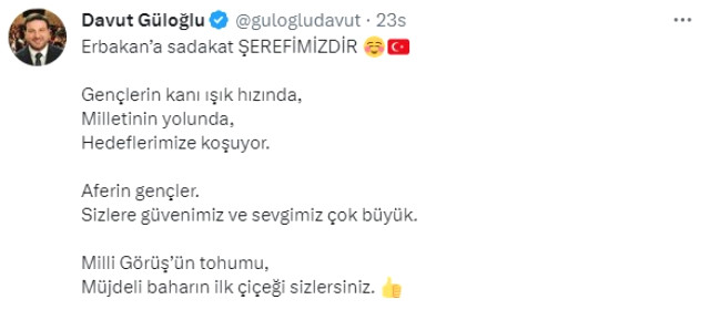 Güloğlu, bir sonraki paylaşımında ise "Erbakan'a sadakat şerefimizdir. Gençlerin kanı ışık hızında, milletinin yolunda. Hedeflerimize koşuyor. Aferin gençler. Sizlere güvenimiz ve sevgimiz çok büyük. Milli görüşün tohumu, müjdeli baharın ilk çiçeği sizlersiniz" ifadelerini kullandı.