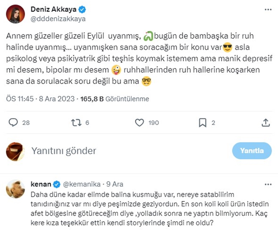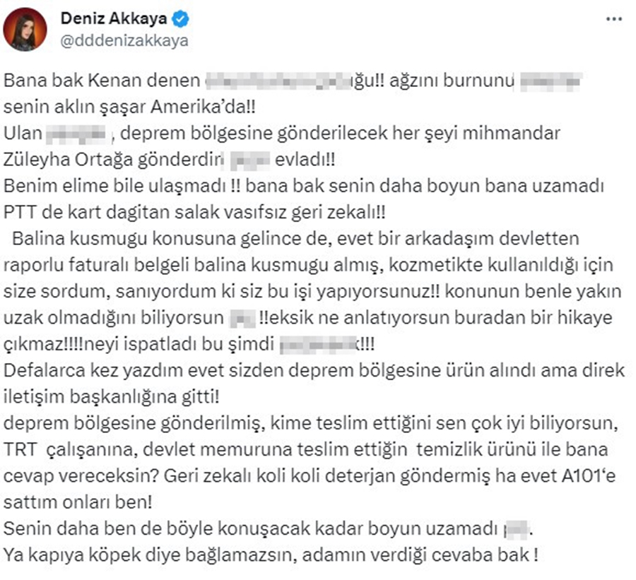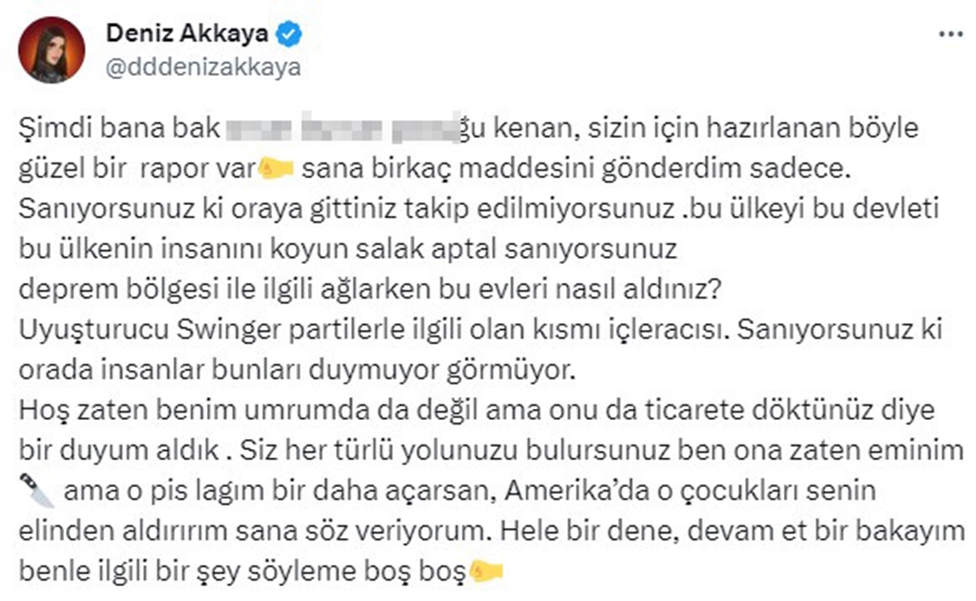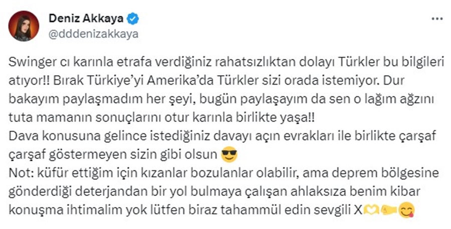 Deniz Akkaya'nın Kenan Öztürk'e yönelik küfürlü sözleri ve çiftin yaşadığı gerilim, sosyal medyanın gündemine oturdu. Deniz Akkaya, "Swingercı karınla etrafa verdiğiniz rahatsızlıktan dolayı Türkler sizi istemiyor. Amerika'daki Türkler sizi orada istemiyor." şeklindeki iddialarıyla olayları daha da karmaşık bir hale getirdi.