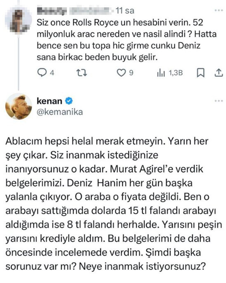 Kenan Öztürk ise sosyal medyada gerçekleştirdiği canlı yayında, Deniz Akkaya'nın sürekli olarak yalanlarla gündeme gelmeye çalıştığını belirterek, "Deniz Hanım her gün başka bir yalanla ortaya çıkıyor." ifadelerini kullandı. Eylül Öztürk ise YouTube kanalında aylık kazançlarını paylaşarak, çiftin mali durumu hakkında açıklamalarda bulundu.