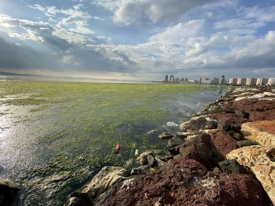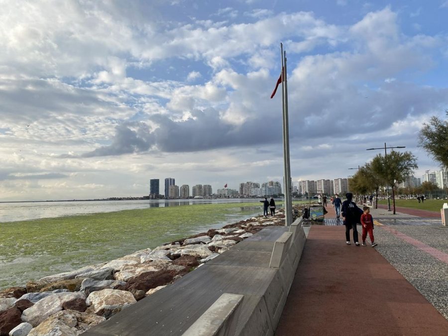 İzmir'in Karşıyaka ilçesi Bostanlı sahilinde deniz yüzeyini halk arasında 'deniz marulu' olarak adlandırılan yeşil su bitkisi kapladı.