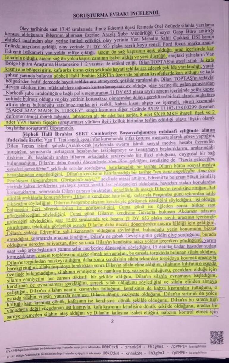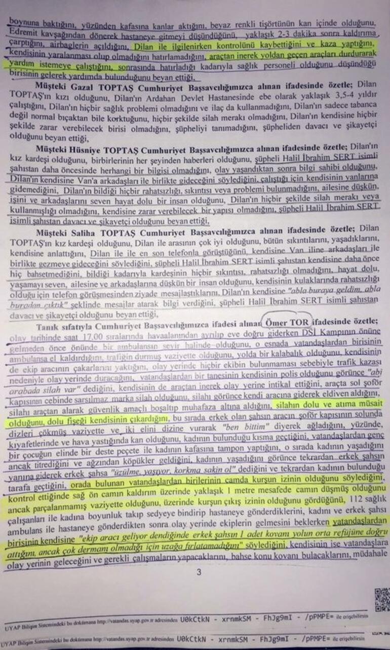 Kız kardeşinin ölümünden sorumlu tuttukları Sert'in çelişkili ifadeler verdiğini belirten Toptaş, "Sert ilk ifadesinde 'Dilan benden maske istedi. Torpidoda maskeyi çıkarırken silah oradaydı. Silahı yanıma aldım. Silah sol elimdeydi. Sağ elimle birlikte tutmuştum, o sırada nasıl patladı bilmiyorum' dedi. Daha sonraki ifadesinde ise, 'Dilan ile arabada seyir halindeydik ve torpidodan maske almaya çalışırken torpidoda buluna silahı aldığını ve kendisine oynamaması gerektiğini silahı yerine koymasını istedim. Silahı almaya çalıştım silahın namlusu Dilan'ın elindeydi kabzasından tutmuştum o sırada bana dönük haldeydi ve bir saniye içinde silah ateş aldı ve başından isabet aldı. Nazını kontrol ettim ve kanlar içindeydi yaklaşık iki dakika sonra refüje çarparak kaza yaptım' şeklinde ifade verdi. Bunlar çelişkili ifadeler. Tahliye olmasını istemiyoruz" ifadelerini kullandı.