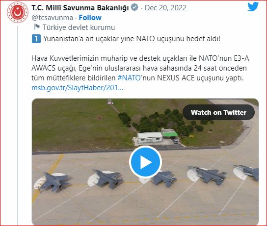 Konuyla ilgili Milli Savunma Bakanlığı'ndan yapılan açıklamada şu ifadeler yer aldı: "Yunanistan'a ait uçaklar yine NATO uçuşunu hedef aldı! Hava Kuvvetlerimizin muharip ve destek uçakları ile NATO'nun E3-A AWACS uçağı, Ege'nin uluslararası hava sahasında 24 saat önceden tüm müttefiklere bildirilen NATO'nun NEXUS ACE uçuşunu yaptı. Yunanistan'a ait F-16 uçakları ise radar kilidi atarak NATO uçuşundaki uçaklarımızı önlemeye çalıştı. Dalaman ve Akhisar'dan kalkan F-16 uçaklarımız da gerekli karşılığı vererek NATO görevinin başarıyla tamamlanmasını sağladı."