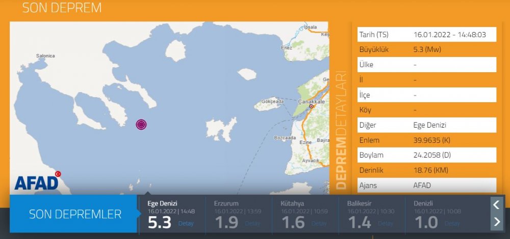 Ege Denizi açıklarında 5,3 büyüklüğünde deprem