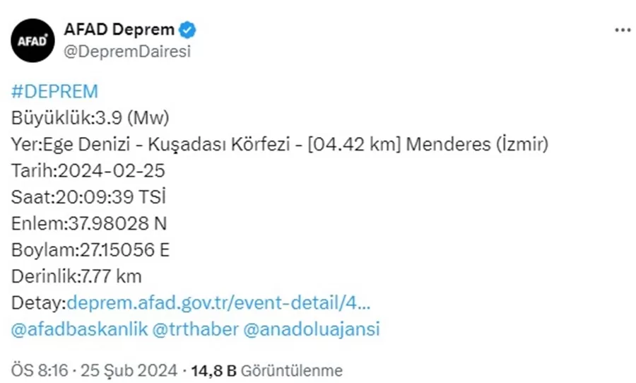 AFAD'ın verilerine göre, saat 20.09'da gerçekleşen depremin merkez üssü Kuşadası Körfezi olarak belirlendi. Deprem, yerin 7,77 kilometre derinliğinde gerçekleşti.