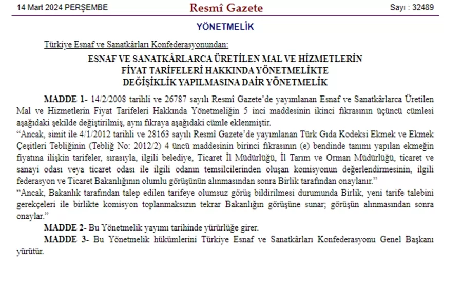 Bu yeni düzenleme, Resmi Gazete'de yayımlanarak yürürlüğe girdi. Artık ekmek ve simit fiyatları üzerinde yapılacak her türlü düzenleme, Ticaret Bakanlığı'nın olumlu görüşü alınmadan gerçekleşemeyecek. Fiyat belirleme süreci; ilgili belediye, Ticaret İl Müdürlüğü, İl Tarım ve Orman Müdürlüğü, ticaret ve sanayi odası veya ticaret odası gibi çeşitli kurumların temsilcilerinden oluşan bir komisyon tarafından yürütülecek.