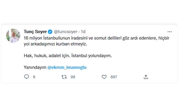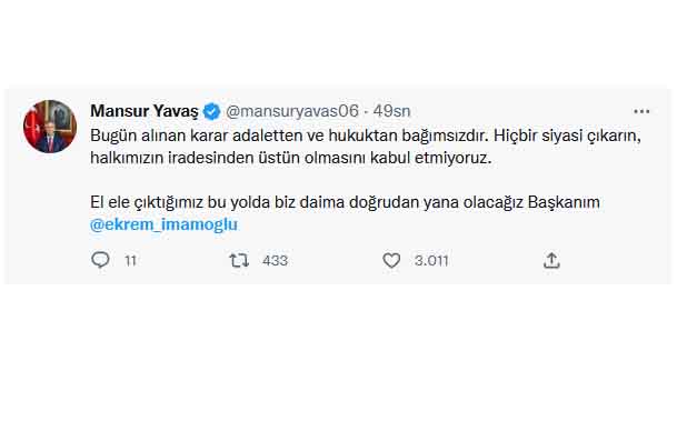 İstanbul Büyükşehir Belediye Başkanı Ekrem İmamoğlu'na verilen 2 yıl 7 ay 15 günlük hapis cezasının açıklanmasının ardından siyasi yasak süreci başladı. Karar eğer onanırsa Ekrem İmamoğlu'na siyasi yasak gelecek. İmamoğlu için verilen hapis cezasına siyasilerden tepki yağdı. İşte o tepkiler: