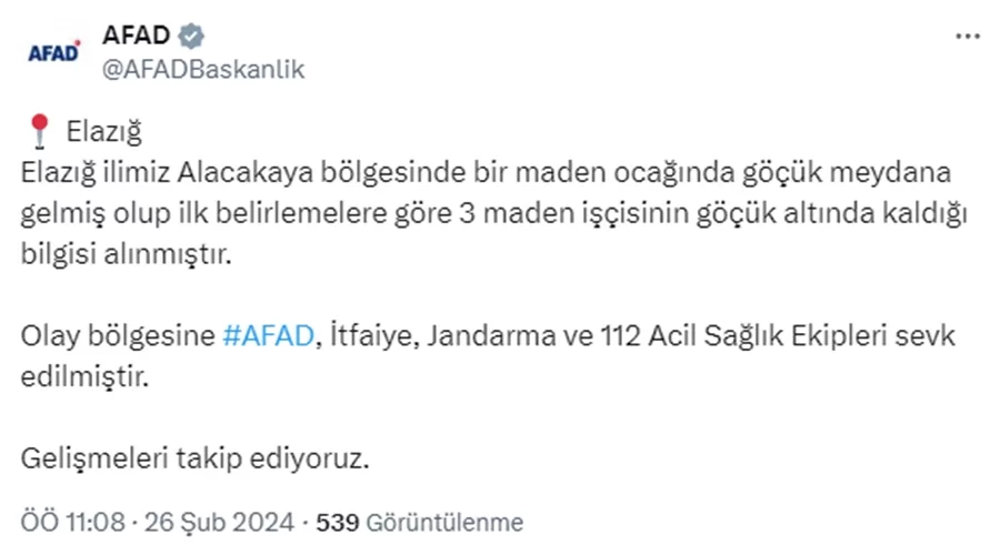 Olayın duyulmasıyla birlikte, AFAD ve UMKE gibi kurtarma ekipleri bölgeye sevk edildi. AFAD, resmi hesabından yaptığı açıklamada, Elazığ'ın Alacakaya bölgesindeki maden ocağında yaşanan göçük sonrasında 3 işçinin toprak altında kaldığını doğruladı. Kurtarma operasyonuna AFAD, itfaiye, jandarma ve sağlık ekiplerinin katıldığı bildirildi. Gündem