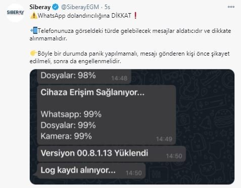 Sosyal medyadan mesaj örneğini paylaşan Siberay'ın iletisinde, ''WhatsApp dolandırıcılığına dikkat! Telefonunuza görseldeki türde gelebilecek mesajlar aldatıcıdır ve dikkate alınmamalıdır. Böyle bir durumda panik yapılmamalı, mesajı gönderen kişi önce şikayet edilmeli, sonra da engellenmelidir.'' ifadeleri kullanıldı.