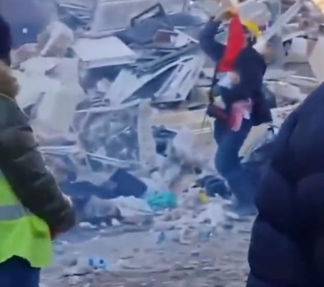 Sosyal medyada paylaşılan görüntülerde bir vatandaş, yıkılan binanın enkazında bulduğu çocuk kıyafetlerine sarılarak ağladı. Kıyafetleri koklayarak feryatlar eden vatandaşın görüntüsü yürekleri burktu.