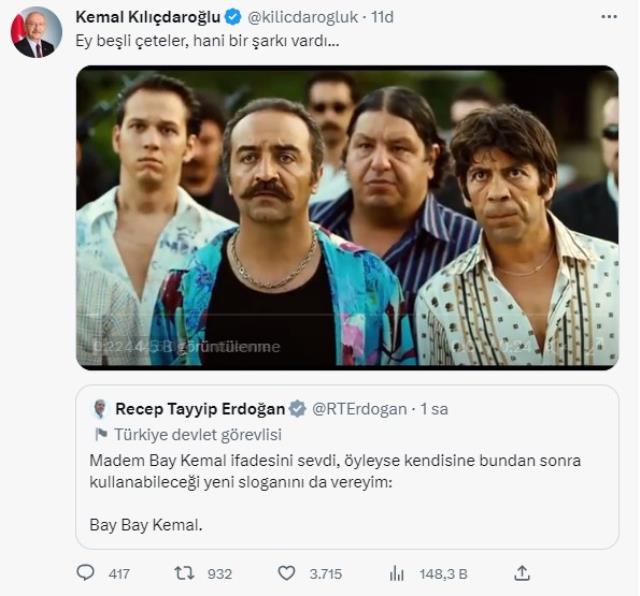 Kılıçdaroğlu ise Cumhurbaşkanı Erdoğan'ın bu tweetini alıntılayarak Yılmaz Erdoğan ve Cem Yılmaz gibi isimlerin rol aldığı 2005 yapımı 'Organize İşler' filminden "Bye Bye Happiness" sahnesini paylaştı. Paylaşımına bir de not düşen CHP lideri, "Ey beşli çeteler, hani bir şarkı vardı..." ifadelerini kullandı.
