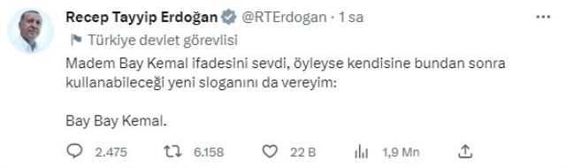 Cumhurbaşkanı Erdoğan ise partisinin bugünkü TBMM'deki grup toplantısında "Bay Kemal" ifadesini kendisinin bulduğunu ve CHP liderinin de bu ifadeyi sevdiğini dile getirdi. Sözlerini sürdüren Erdoğan, "Biliyorsunuz CHP'nin başındaki zata, 'Bay Kemal' diye hitap ediyoruz. Memleketin her işi gibi muhalefetin adayının sloganını bulmak da bize kaldı. Madem 'Bay Kemal' bu ifadeyi o kadar sevdi, öyleyse bundan sonra kendisine kullanacağı yeni sloganını da vereyim: Bay bay Kemal" dedi.