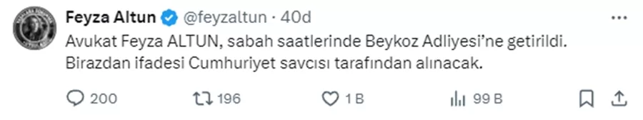 Avukat Feyza Altun, sosyal medya üzerinden şeriat karşıtı ifadeler kullanmasının ardından başlatılan soruşturma kapsamında, Beykoz Adliyesi'ne getirildi. Savcılığa ifade verecek olan Altun'un, halkı kin ve düşmanlığa tahrik suçlamasıyla karşı karşıya olduğu öğrenildi. Emrah Karatay sosyal medya üzerinden yaptığı paylaşımda şu ifadelere yer verdi:Müvekkilim ve meslektaşım Feyza Altun ile Vatan Emniyet'te birlikteyiz. Kamuoyunda dolaşan birtakım yanlış ve art niyetli paylaşım ve haberlere istinaden bu açıklamayı avukatı olarak yapıyorum. Hakkında şeriat aleyhtarı tweetleri yüzünden başlatılan soruşturma kapsamında gözaltına alınmıştır. Hakkındaki iddia 'halkı kin ve düşmanlığa tahrik'tir. Bunun dışında hiçbir suçlama bulunmamaktadır. İsnat olunan suçun kanunda tanımlanan şeklinin oluşmaması bir yana, 6 aydan 1 yıla kadar hapis cezası olan, erteleme, paraya çevirme ve HAGB gibi alternatif hükümlerin alınması kuvvetle muhtemel olan bir suç isnadı nedeniyle, her gün adliyede olan, hakkındaki her şikayette daha çağrılmadan savcılığa ifade vermeye giden bir avukatı gözaltına almayı hukukla izah etmek, biz hukukçular için mümkün değildir. Türkiye'de rejim tartışmaları, 29 Ekim 1923'te son bulmuştur. Devletin dini İslam'dır" maddesi Anayasadan 1928 yılında çıkarılmıştır. Laiklik 1937 yılında Anayasaya girmiş, yürürlükte olan Anayasamızla da laiklik, Anayasanın değiştirilmesi teklif dahi edilemez kuralı haline gelmiştir. Bugün, şeriat taraftarları, Anayasanın değiştirilmesi teklif dahi edilemez hükmünün hilafına beyanlarda bulunurken bunu görmezden gelen, adliye koridorlarında şeriat sloganları atanlara hiçbir işlem uygulamayan savcılık makamının, kışkırtıcı dahi olsa, şeriat karşıtı beyanları nedeniyle bir avukatı gözaltına almasını, hukuka çalınmış bir şerh olarak görüyoruz. İşlemediğini bildikleri bir suç nedeniyle müvekkilim hakkında uygulanan gözaltı kararı dahi saçma iken tutuklanması yolunda sosyal medya çalışması yapan, galiz küfürlerle müvekkilimin şahsına saldıran kişiler ve basın kuruluşları hakkında ise suç duyurusunda bulunacağız. Müvekkilim buraya başı dik girmiştir. Buradan da başı dik çıkacaktır. Kamuoyuna saygılarımızla bildiririz.