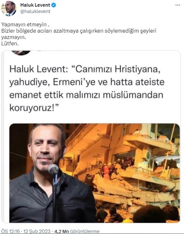 Haluk Levent Twitter hesabından iddialara karşı sessizliğini bozdu. Ünlü şarkıcı, "Yapmayın etmeyin . Bizler bölgede acıları azaltmaya çalışırken söylemediğim şeyleri yazmayın. Lütfen." paylaşımıyla iddiayı yalanladı.