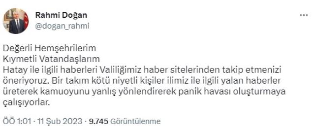Hatay ile ilgili haberleri Valiliğimiz haber sitelerinden takip etmenizi öneriyoruz. Birtakım kötü niyetli kişiler ilimiz ile ilgili yalan haberler üreterek kamuoyunu yanlış yönlendirerek panik havası oluşturmaya çalışıyorlar."
