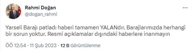 Hatay Valisi Rahmi Doğan, Twitter hesabından yaptığı paylaşımda, iddiaların asılsız olduğunu belirterek şunları söyledi: "Yarseli Barajı patladı haberi tamamen yalandır. Barajlarımızda herhangi bir sorun yoktur. Resmi açıklamalar dışındaki haberlere inanmayın.