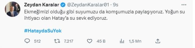 Adana Büyükşehir Belediye Başkanı Zeydan Karalar, Twitter hesabından yaptığı açıklamada "Ekmeğimizi olduğu gibi suyumuzu da komşumuzla paylaşıyoruz. Yoğun su ihtiyacı olan Hatay'a su sevk ediyoruz" dedi