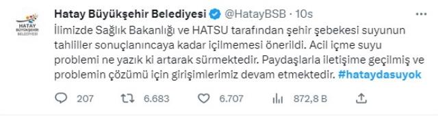 Konu ile ilgili Hatay Büyükşehir Belediyesi de şu paylaşımda bulundu: "İlimizde Sağlık Bakanlığı ve HATSU tarafından şehir şebekesi suyunun tahliller sonuçlanıncaya kadar içilmemesi önerildi. Acil içme suyu problemi ne yazık ki artarak sürmektedir. Paydaşlarla iletişime geçilmiş ve problemin çözümü için girişimlerimiz devam etmektedir. #hataydasuyok"