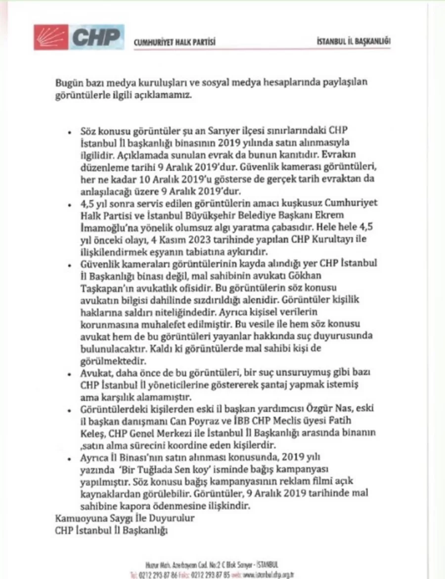 Açıklamada, söz konusu görüntülerin Sarıyer ilçesi sınırlarındaki CHP İstanbul İl Başkanlığı binasının 2019 yılında satın alınmasıyla ilgili olduğu belirtildi. Yapılan açıklamada, "Söz konusu görüntüler, il binamızın 2019 yılında satın alınması süreciyle alakalıdır. Sunulan evraklar, bu iddiayı doğrulamaktadır. Evrakların düzenleme tarihi 9 Aralık 2019 olarak kayıtlıdır. Güvenlik kamerası görüntüleri 10 Aralık 2019'u gösterse de, gerçek tarih evrakta net bir şekilde belirtilmiştir: 9 Aralık 2019." denildi.