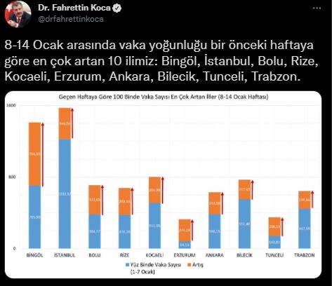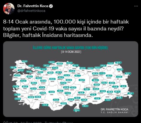 Bakan Koca, "8-14 Ocak arasında, 100.000 kişi içinde bir haftalık toplam yeni Covid-19 vaka sayısı il bazında neydi? Bilgiler, haftalık İnsidans haritasında." dedi.