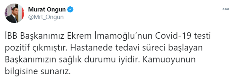 İBB Sözcüsü Murat Ongun yaptığı paylaşımda, "İBB Başkanımız Ekrem İmamoğlu'nun Covid-19 testi pozitif çıkmıştır. Hastanede tedavi süreci başlayan Başkanımızın sağlık durumu iyidir. Kamuoyunun bilgisine sunarız" ifadelerini kullandı.