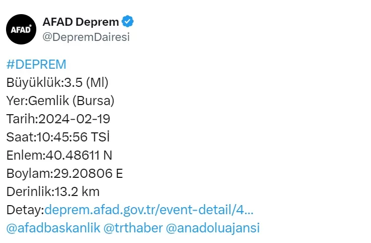 19 şubat 2024 pazartesi günü deprem oldu. İstanbul ve Bursa'da hissedilen bir deprem meydana geldi. Depremin şiddeti kaç?