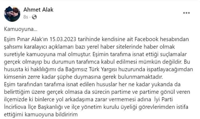 Açıklamasının devamında partisinden istifa ettiğini belirten Alak, "Eşim tarafından tarafıma isnat edilen hususlar her ne kadar yukarıda da belirttiğim üzere gerçek olmasa da sürecin partime ve partime gönül veren ilçemizde ki binlerce yol arkadaşıma zarar vermemesi adına İYİ Parti İncirliova İlçe Başkanlığı ve ilçe yönetim kurulu üyeliği görevlerimden istifa ettiğimi kamuoyuna bildiririm" dedi.