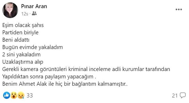Paylaşımında, "Eşim olacak şahıs partiden biriyle beni aldattı. Bugün evimde yakaladım ikisini. Uzaklaştırma alıp, gerekli kamera görüntüleri kriminal inceleme adli kurumlar tarafından yapıldıktan sonra paylaşacağım. Benim Ahmet Alak ile hiçbir bağlantım kalmamıştır" ifadelerini kullanan Alak, başkan olan eşi için de 30 günlük uzaklaştırma kararı verildiğini duyurarak "Bu parti benim her şeyimi çaldı" diyerek İYİ Parti üyeliğinden de istifa ettiğini belirtti.
