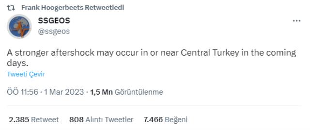 "Deprem kahini" lakaplı ünlü deprem uzmanı Hoogerbeets'in şirketi Solar System Geometry Survey (SSGEOS) sosyal medya üzerinden yaptığı paylaşımda bu sefer İç Anadolu Bölgesi için uyardı. Paylaşımda, 7.7 ve 7.6'lık depremler sonrası önümüzdeki günlerde İç Anadolu'da daha güçlü bir artçı sarsıntı meydana gelebileceği belirtildi.