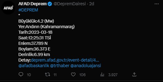 Kahramanmaraş'ın Andırın ilçesinde saat 12.25'te, 4.2 büyüklüğünde deprem meydana geldi. Depremin derinliği 6.99 kilometre olarak kaydedildi.