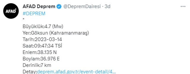 AFAD'dan yapılan açıklamaya göre; Kahramanmaraş'ın Göksun ilçesinde saat 09.47'de 4.7 büyüklüğünde deprem oldu. Sarsıntı yerin 7 kilometre derinliğinde gerçekleşti. Deprem çevre illerde de hissedildi.