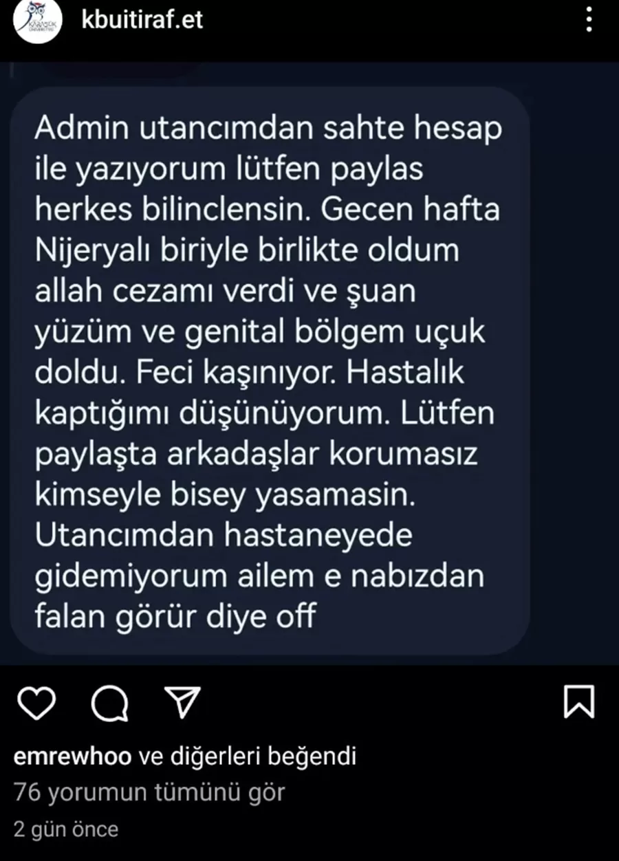 Üniversitenin itiraf sayfasında yapılan paylaşımlarda, Türk öğrencilerin Afrika kökenli öğrencilerle yaşadıkları ilişkilerin ardından HPV ve HİV gibi ciddi sağlık sorunlarıyla karşı karşıya kaldıkları iddia edildi.
