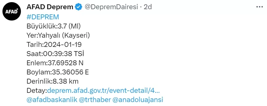 Son dakika AFAD ve Kandilli Rasathanesi 19 Ocak son depremleri duyurdu. Kayseri'de gece yarısı 00:39'da 3.7 şiddetinde deprem meydana geldi.