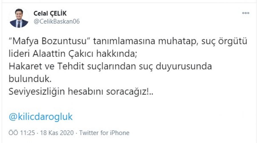 'Mafya Bozuntusu' tanımlamasına muhatap, suç örgütü lideri Alaattin Çakıcı hakkında; Hakaret ve Tehdit suçlarından suç duyurusunda bulunduk. Seviyesizliğin hesabını soracağız!"