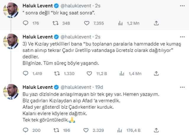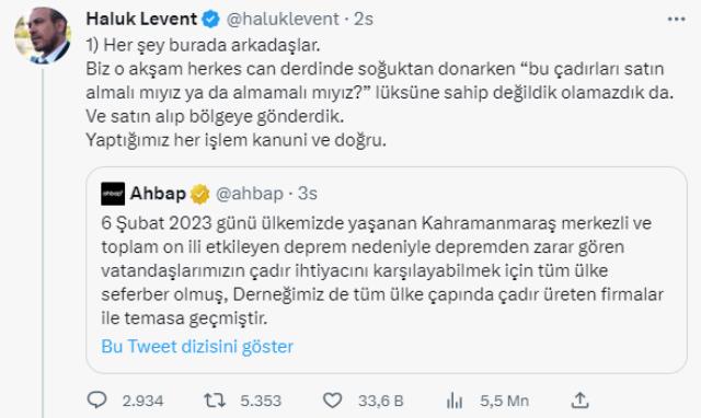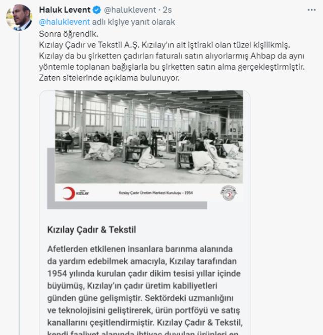 Kamuoyunda geniş yankı uyandıran iddiaya ilk yanıt veren Haluk Levent oldu. Twitter hesabından Ahbap'ın yaptığı açıklamayı alıntılayan Levent şu ifadeleri kullandı; "Biz o akşam herkes can derdinde soğuktan donarken 'bu çadırları satın almalı mıyız ya da almamalı mıyız?' lüksüne sahip değildik olamazdık da. Ve satın alıp bölgeye gönderdik. Yaptığımız her işlem kanuni ve doğru. Sonra öğrendik. Kızılay Çadır ve Tekstil A.Ş. Kızılay'ın alt iştiraki olan tüzel kişilikmiş. Kızılay da bu şirketten çadırları faturalı satın alıyorlarmış Ahbap da aynı yöntemle toplanan bağışlarla bu şirketten satın alma gerçekleştirmiştir. Zaten sitelerinde açıklama bulunuyor. Ve Kızılay yetkilileri bana 'bu toplanan paralarla ham madde ve kumaş satın alınıp tekrar Çadır üretilip vatandaşa ücretsiz olarak dağıtılıyor' dediler."