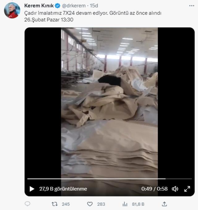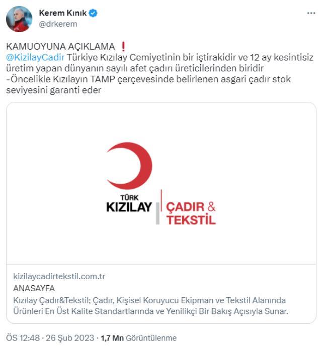 Konuyla ilgili Twitter hesabından da açıklama yapan Kerem Kınık, şu ifadeleri kullanmıştı: "Kızılay Çadır & Tekstil A.Ş, Türkiye Kızılay Cemiyetinin bir iştirakidir ve 12 ay kesintisiz üretim yapan dünyanın sayılı afet çadırı üreticilerinden biridir. -Öncelikle Kızılayın TAMP çerçevesinde belirlenen asgari çadır stok seviyesini garanti eder" ifadelerini kullandı. Kınık açıklamalarına şu şekilde devam etti: "Ayrıca -Barınma hizmet kümesi sorumlusu olan AFAD'ın kendisinden tedarik etmek için sipariş verdiği sayıda çadırı istenilen zamanda imal eder. -Sağlık Bakanlığı, MSB gibi kamu kuruluşlarının ve Birleşmiş Milletler ve diğer Uluslararası kuruluşların taleplerini üretir.