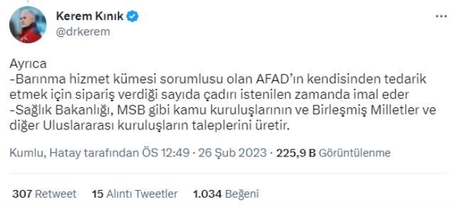 Kınık, sözlerini şu şekilde sürdürdü: "Birinci sorumluluk AFAD'ımızda olmak üzere bütün dünyanın çadır stokunu seferber etmek için çalışıyoruz. Çok hızlı bu sürecin çözülmesi için bağlantılar yapıyoruz. AHBAP bir bağış almış ve bunu bir bedel üzerinden verecek. Biz daha düşük maliyetle sahaya seferber ettik. Bu çadırlar yine vatandaşlarımıza gitti. Burada herhangi bir kötü niyet aramaya gerek yok. Ahbap bunu talep etmese biz yine çadırı AFAD'a teslim edecektik."