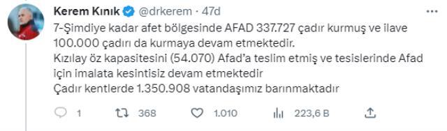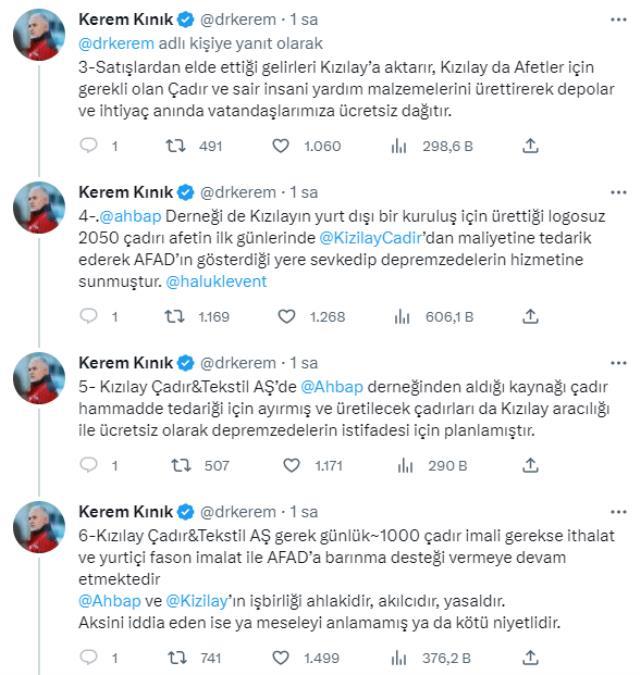 Kızılay'ın çadır satmasının rutin bir işlem olduğunu söyleyen Kınık, "2 bin 50 çadırımız Ahbap'a maliyet fiyatıyla teslim edildi, onlar da AFAD'ın gösterdiği yerlere sevk etti. Bu alınan maliyet bedelleri yine vatandaşın hizmetinde kullanılıyor. Bu rutin bir işlem. Finansal süreklilik için kurumlara maliyetine satış yapıyoruz. Uluslararası afetlere destek verebilecek hem BM'ye hem de Türkiye'deki Sağlık Bakanlığı'mıza, Milli Savunma Bakanlığı'na bu çadırları üretip satıyoruz ki finansal sürdürülebilirliği ve kapasitenin korunabilirliği mümkün olsun." ifadelerini kullandı.