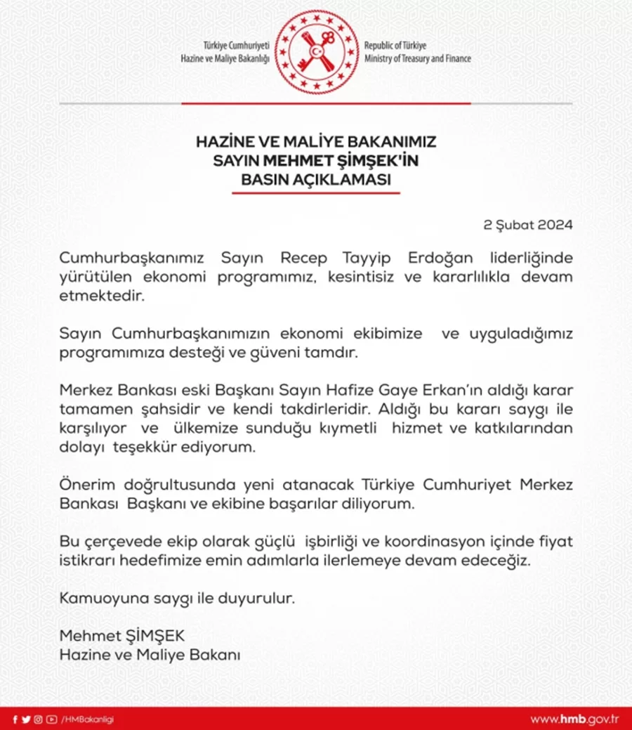Türkiye Cumhuriyet Merkez Bankası Başkanı Hafize Gaye Erkan, sosyal medya hesabından yaptığı paylaşımla, "görevinden affını istediğini" açıkladı. Erkan'ın istifası sonrası Bakan Mehmet Şimşek, ekonomi politikalarındaki istikrarın devam edeceğine vurgu yaparak önerisi doğrultusunda atanacak yeni başkan ve ekibine güven duyduklarını belirtti. Şimşek'in açıklaması şöyle: