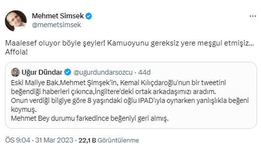Uğur Dündar'ın paylaşımını alıntılayan Mehmet Şimşek de "Maalesef oluyor böyle şeyler! Kamuoyunu gereksiz yere meşgul etmişiz…Affola!" açıklamasında bulundu.