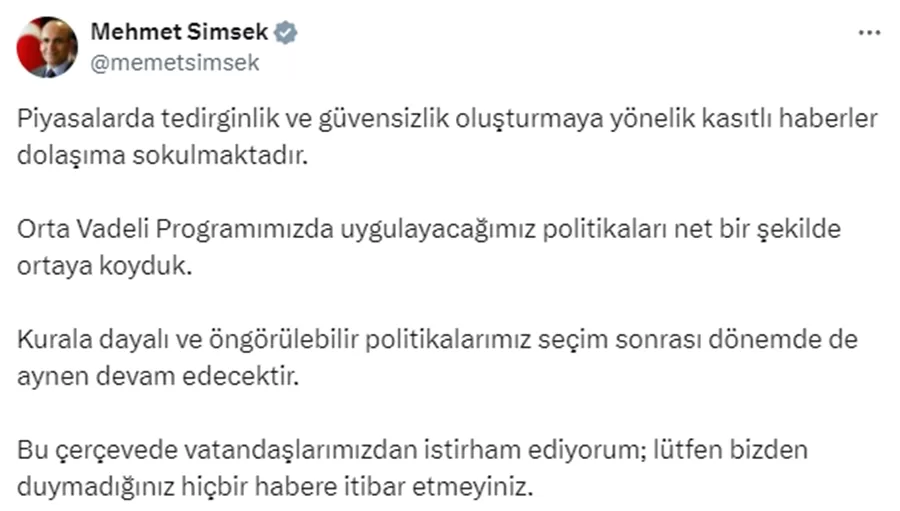 Bakan Şimşek, "Orta Vadeli Program kapsamında belirlenen politikaların, öngörülebilir ve kurala dayalı bir şekilde sürdürüleceğini" belirterek, halkı sakin olmaya ve spekülatif haberlere itibar etmemeye davet etti.