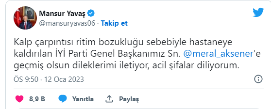 Ankara Büyükşehir Belediye Başkanı Mansur Yavaş, kalp ritim bozukluğu nedeniyle hastaneye kaldırılan Akşener'e geçmiş olsun dileklerini iletti.