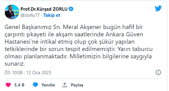 "Genel Başkanımız Sn. Meral Akşener bugün hafif bir çarpıntı şikayeti ile akşam saatlerinde Ankara Güven Hastanesi’ne intikal etmiş olup çok şükür yapılan tetkiklerinde bir sorun tespit edilmemiştir. Yarın taburcu olması planlanmaktadır. Milletimizin bilgilerine saygıyla sunarız."