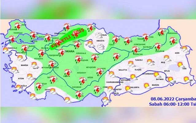 Meteoroloji Genel Müdürlüğü tarafından yapılan son değerlendirmelere göre: Ülkemiz genelinin parçalı ve yer yer çok bulutlu, Marmara, Akdeniz, İç Anadolu, Karadeniz, Doğu Anadolu’nun kuzeyi, Gaziantep, Kilis, Kütahya, Afyonkarahisar ve Van çevrelerinin yerel olmak üzere sağanak ve gök gürültülü sağanak yağışlı geçeceği tahmin ediliyor. Yağışların Karadeniz’in iç kesimleri (Bolu, Karabük, Kastamonu, Amasya, Tokat, Çorum, Gümüşhane, Bayburt, Artvin ile Sinop, Samsun, Ordu, Giresun ve Trabzon’un iç kesimleri), Akdeniz’in iç kesimleri (Isparta, Burdur, Antalya'nın kuzeybatısı, Kahramanmaraş’ın batısı ile Adana, Mersin ve Osmaniye’nin kuzeyi), İç Anadolu’nun güney ve doğusu (Kırıkkale, Sivas, Yozgat, Kırşehir, Kayseri, Nevşehir, Niğde, Aksaray, Konya, Karaman) ile Ankara, Çankırı, Kars ve Ardahan çevrelerinde yerel olarak kuvvetli olması bekleniyor.