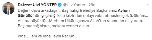 Evli ve 2 çocuk babası olan Gönüllü, MHP'yi de yasa boğdu. MHP Genel Başkan Yardımcısı İzzet Ulvi Yönter, paylaştığı mesajında, "Değerli dava arkadaşım, Başmakçı Belediye Başkanımız Ayhan Gönüllü'nün geçirdiği kalp krizinden dolayı vefat etmesine çok üzüldüm… Acımız büyüktür… Merhum Ülküdaşımıza Allah'tan rahmetler diliyorum. Başımız sağ olsun, mekanı cennet olsun. İnna Lillâhi ve İnnâ İleyhi Raciûn…" ifadelerini kullandı.