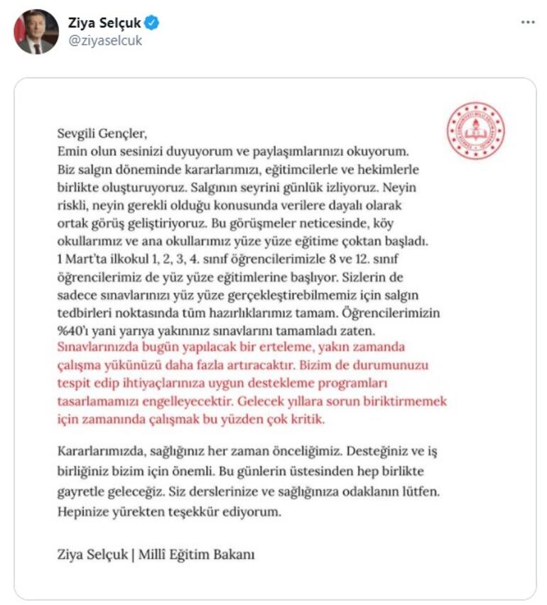 Kararlarımızda, sağlığınız her zaman önceliğimiz. Desteğiniz ve iş birliğiniz bizim için önemli. Bu günlerin üstesinden hep birlikte gayretle geleceğiz. Siz derslerinize ve sağlığınıza odaklanın lütfen. Hepinize yürekten teşekkür ediyorum.