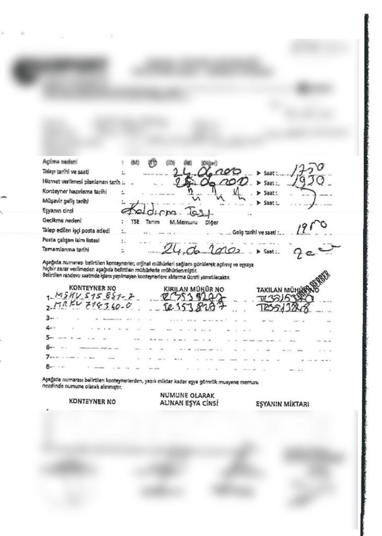 İstanbul, Çorlu ve Tekirdağ’daki birçok şirket isminin geçtiği soruşturma dosyasında yeni ayrıntılar ortaya çıktı. Ambarlı Limanı’na Haziran ile Ağustos ayları arasında gelen 10 ton ağırlığındaki 326 konteyner gemilere yüklenmeden önce yapılan incelemede 23 Haziran 2020 tarihinde gelen 2 konteyner üzerindeki mühürlerin seri numaraları görevlilerin dikkatini çekti.