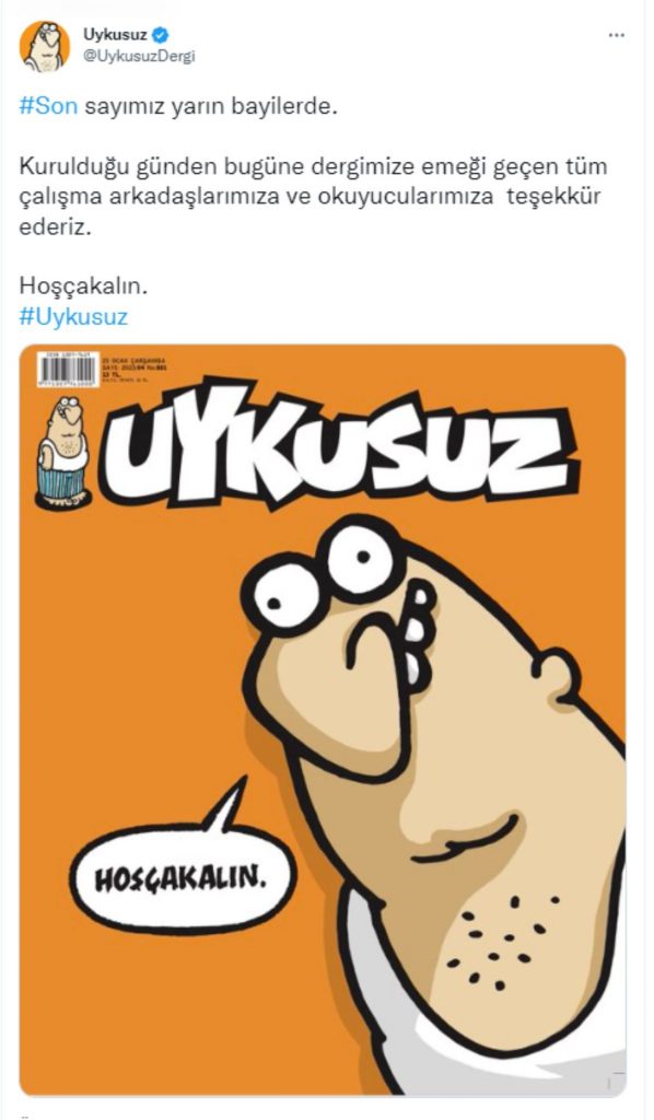 Mizah dergisi Uykusuz, yarın son sayısının çıkacağını belirterek, “Kurulduğu günden bugüne dergimize emeği geçen tüm çalışma arkadaşlarımıza ve okuyucularımıza teşekkür ederiz” açıklaması yaptı.