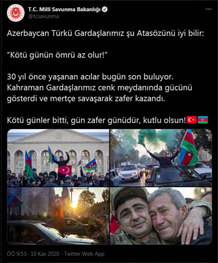 Bakanlığın Twitter hesabından yapılan açıklamada, "Azerbaycan Türkü gardaşlarımız şu atasözünü iyi bilir; 'Kötü günün ömrü az olur!' 30 yıl önce yaşanan acılar bugün son buluyor. Kahraman gardaşlarımız cenk meydanında gücünü gösterdi ve mertçe savaşarak zafer kazandı. Kötü günler bitti, gün zafer günüdür, kutlu olsun!" denildi.