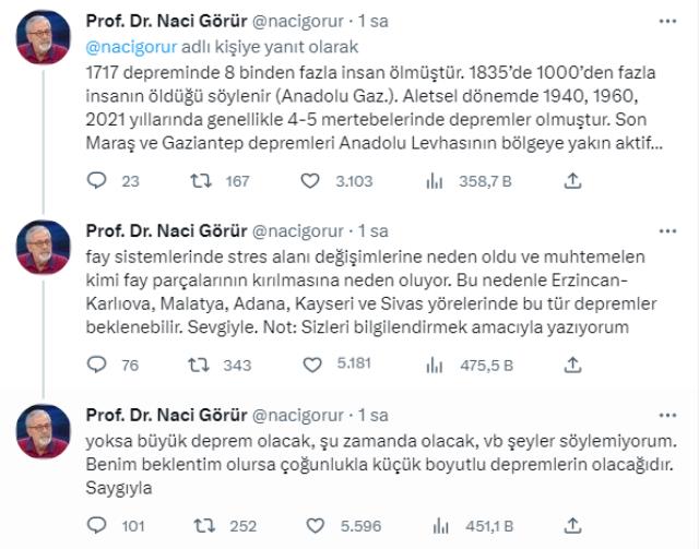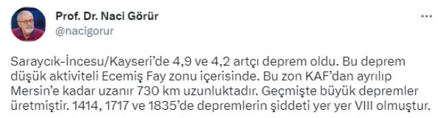 "Saraycık-İncesu/Kayseri'de 4.9 ve 4.2 artçı deprem oldu. Bu deprem düşük aktiviteli Ecemiş Fay zonu içerisinde. Bu zon KAF'dan ayrılıp Mersin'e kadar uzanır 730 km uzunluktadır. Geçmişte büyük depremler üretmiştir. 1414, 1717 ve 1835'de depremlerin şiddeti yer yer VIII olmuştur. 1717 depreminde 8 binden fazla insan ölmüştür. 1835'de 1000'den fazla insanın öldüğü söylenir (Anadolu Gaz.). Aletsel dönemde 1940, 1960, 2021 yıllarında genellikle 4-5 mertebelerinde depremler olmuştur.